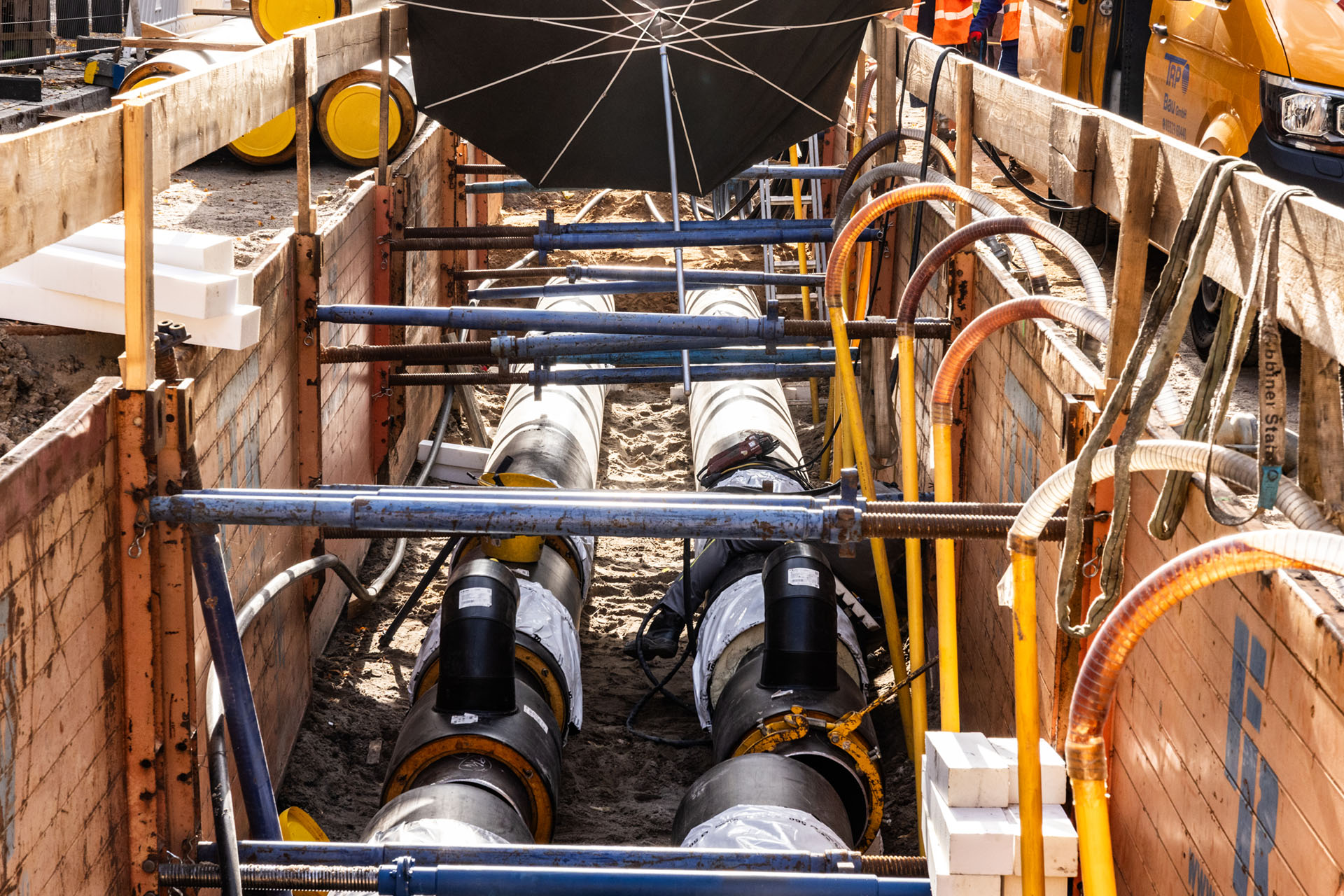 Die Maßnahme umfasst den Neubau von Fernwärmeleitungen aus Kunststoffmantelrohren DN 400 auf einer Länge von rund 160 Metern, die parallel zur bestehenden Kanaltrasse verlegt wurden. Zudem erfolgen die Anbindungen an den vorhandenen Fernwärmebestand der Verteilleitungen sowie Umschlüsse von insgesamt sechs Fernwärmeanschlüssen. Für den zukünftigen Betrieb wurde ein Entleerungsschacht d1000 in einer Tiefe von etwa vier Metern hergestellt.